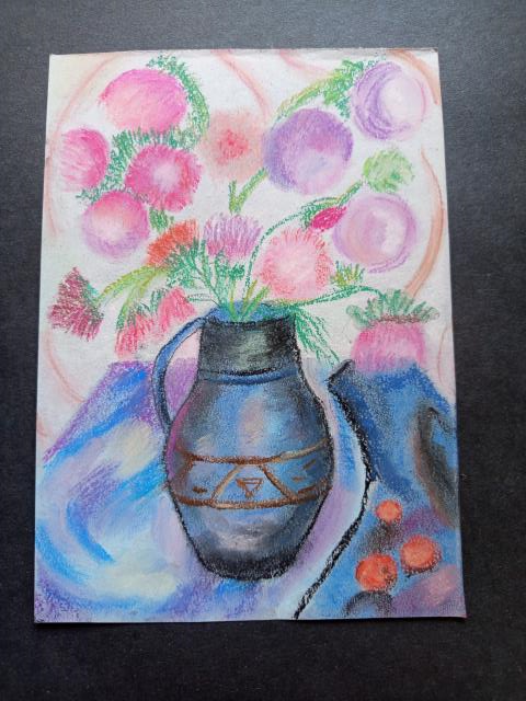 У меня только 2 новых пастели, вроде я одну уже здесь показывала, вторая точно свежая. Вчера закосячила на занятии пастель, хочу дома сама переделать. Такой натюрморт был с сиренью шикарный, у меня вообще ничего кроме корзинки не получилось...