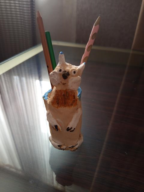 У дочки несколько мелких работ готовы - Кошка-карандашница, бычок, кактус цветущий и колокольчик. И ее керамическое панно Щедрая осень заняло 2 место в межрегиональном конкурсе ДПИ в номинации Керамика
