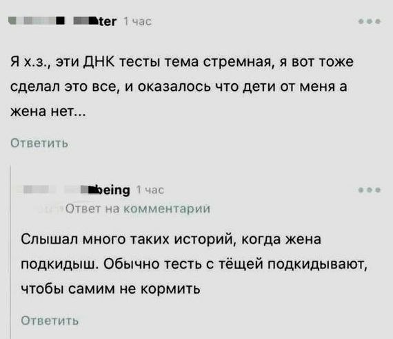 Свекровь на невестку бочку катит. Мол, сын погиб, а с ДНК ребенка не совпало. Я спросила, а с вашим есть совпадение у погибшего, с кем документы вашего сына нашли? Может боец не ваш. Блииин, лучше б я молчала.