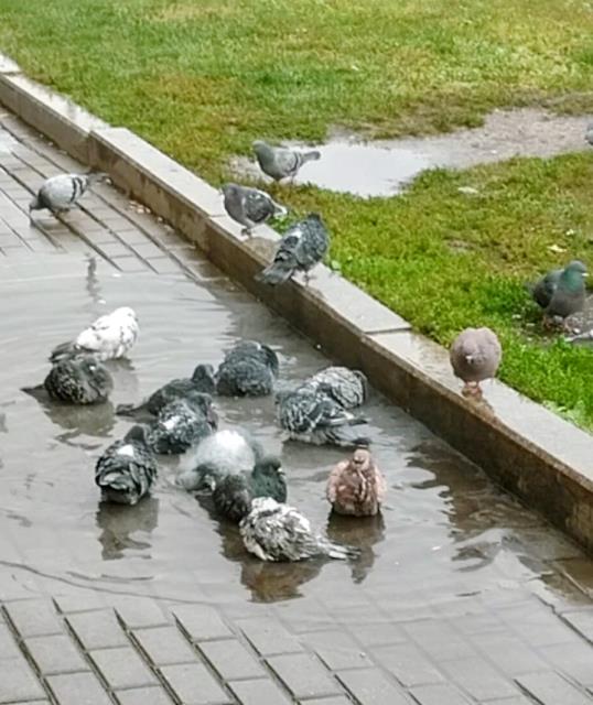 У нас +5, у голубей водные процедуры. А вечерняя, это под вчерашним дождем. Ждём снега.