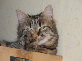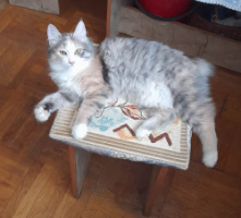 Когтеточек у нас две - одна на стене (фанерка и кусок ковролина) и на полу (гофрированный картон с кошачьей мятой). Использует обе. Между ними стоит кресло, может и бок кресла подрать, хотя знает, что нельзя, просто вредничает.
