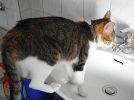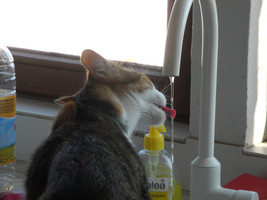 Воду пьет она только из-под крана. Вспрыгивает либо на раковину на кухне, либо прыгает в ванну. Все понимают, что ей надо. Главное, потом не забыть закрыть кран:) Предыдущая кошка тоже пила из-под крана, фонтанчик не прижился. Первая кошка спокойно пила из миски.