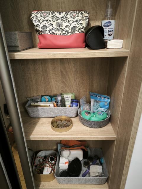 Зонт живет в машине, там же и сумки/ пакеты. Таблетки в сумке лежат те, которые принимаются вне дома. Запас пополняется, но это все точно не в спальне живет. В гардеробной только одежда и туфли, ну и всяческие бусики.