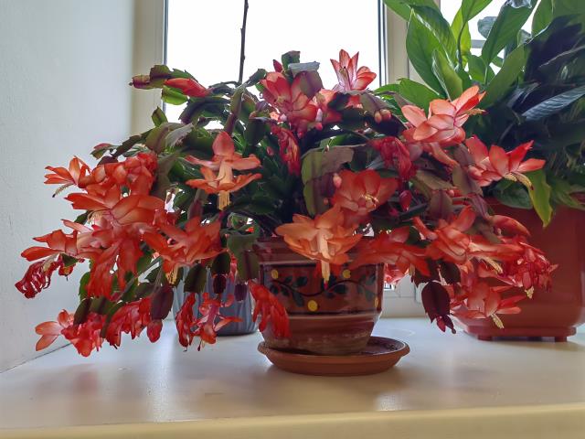 А у нас уже декабрь, вовсю декабристы цветут. Мой белый пока скромненько, а на работе просто буйство какое-то. Удивительный экземпляр, каждый год так полыхает.