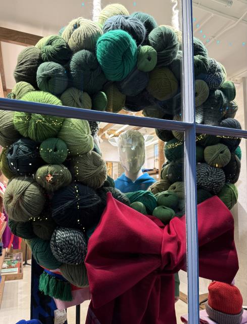 На витрине магазинчика с пряжей мне понравился рождественский венок, а уже позже я увидела, что в середине из венка выглядывает носитель шерсти:)