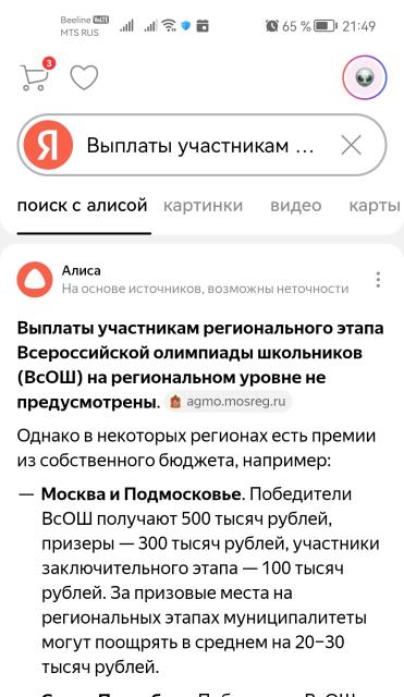 Это про закл: за победу в финале — 500 тысяч рублей, за призовое место — 300 тысяч рублей, а за участие в заключительном этапе — 100 тысяч рублей (как член сборной Москвы). Но "Школьник может получить выплаты за несколько предметов, но не более чем по двум лучшим результатам, как следует из постановления". То есть , если вы победили по трем предметам, получите за два) 23.12.2025 22:19:10, Ольга1999 тел