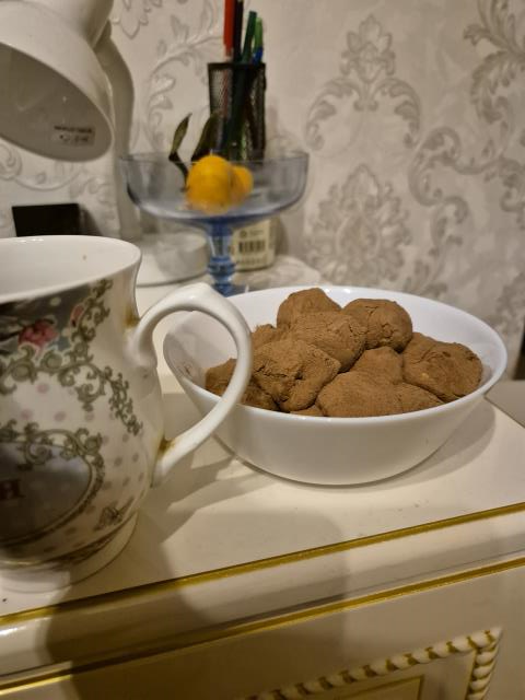От наверно еще со старых времен) Какао я взяла без сахара, печенье, грецкие и фундук.