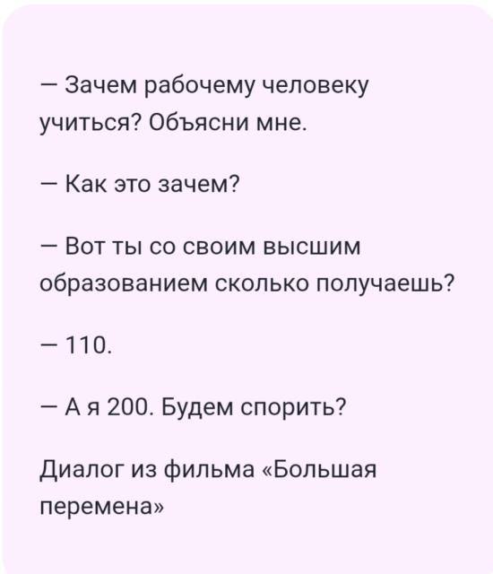 И как раз потому что всем им после 9-го класса вся школа умоляла забрать документы. Но мотивации были вплоть да таких "А нас все в семье получили высшее и меня свекровь с г@вном съест, если Артем не пойдет в 10 класс". Ну сходил. Потерял год. Не знаю, с чем ее свекровь потом съела.