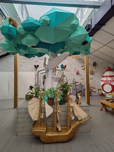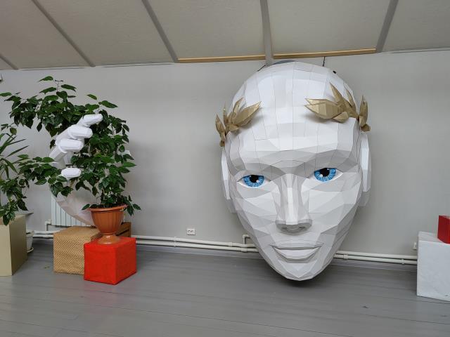Среди выпускныx работ был и тканый на раме гобелен, и горельефные "Сказки Пушкина", из банального шамота... и вот такая 3-Д-скульптура из ватмана, все расчеты и разрезы вручную... и создавалась она на нашиx глазаx. В общем, я поняла, что ТАК работать с бумагой не смогу никогда, как и никогда не дотянусь до классической живописи :-)