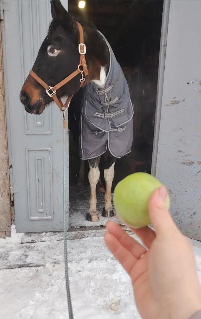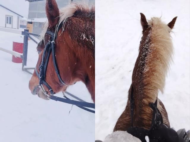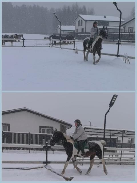 Такде тренировались в самый снегопад, превратились с конем в ездящий сугроб. Переодела мальчика в зимнее пальто.