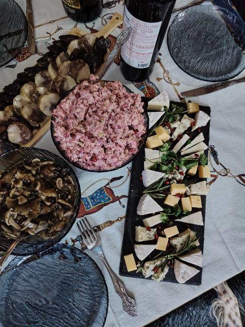 Не смогла пройти мимо - от нашего стола вашему столу)) Селёдка под шубой у нас с вами в похожих ёмкостях и грибочки)