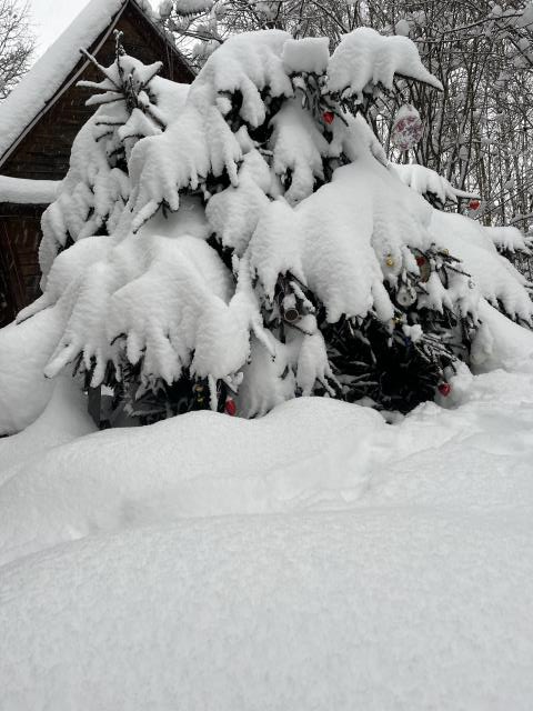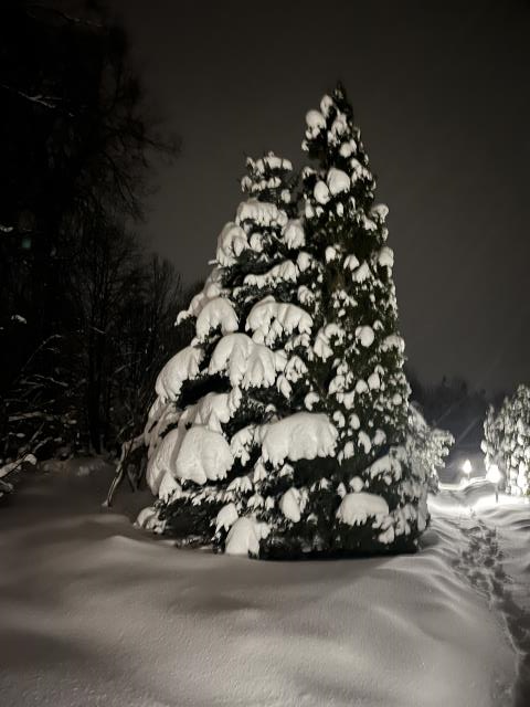 Год начался спокойно, это радует. Покажу тоже много снега на даче. моя новогодняя елка засыпана до макушки, игрушки еле видны. Еще красивая туя в обнимку с елкой , прям как жених и невеста стоят