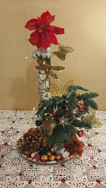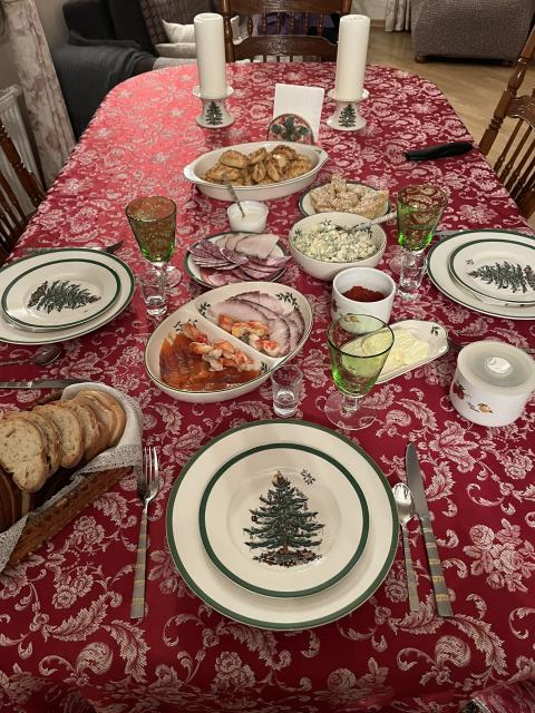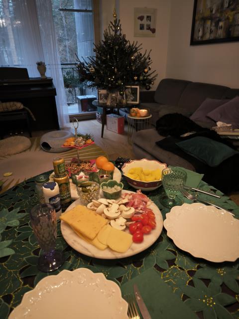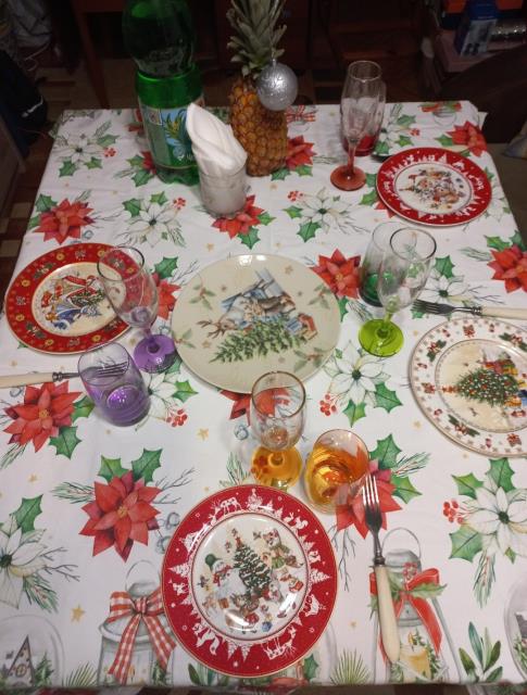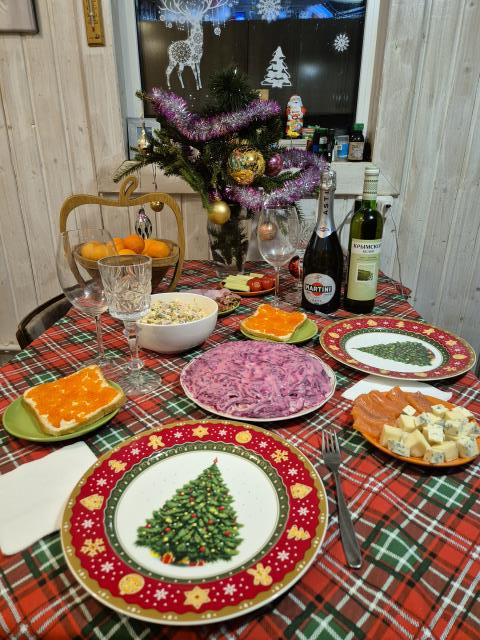 А в этом году рождественский стол был у сына, там никакой особой сервировки не было из-за большой компании и недостатка места на столе :-), а НГ был встречен на Диваныче, вообще без сервировки и без гостей :-)