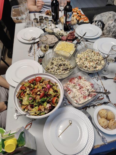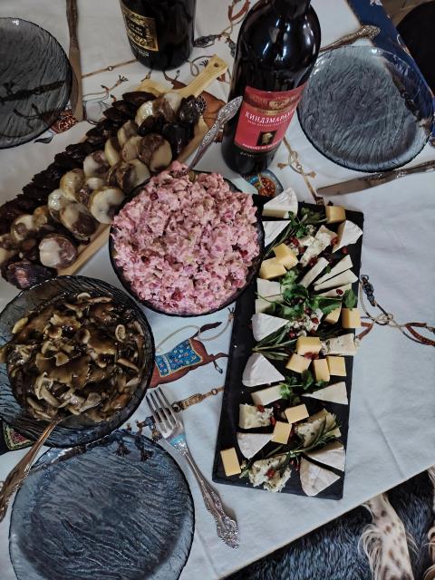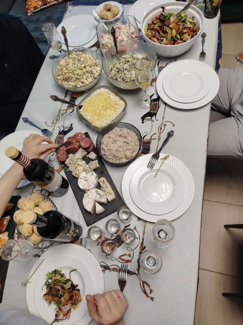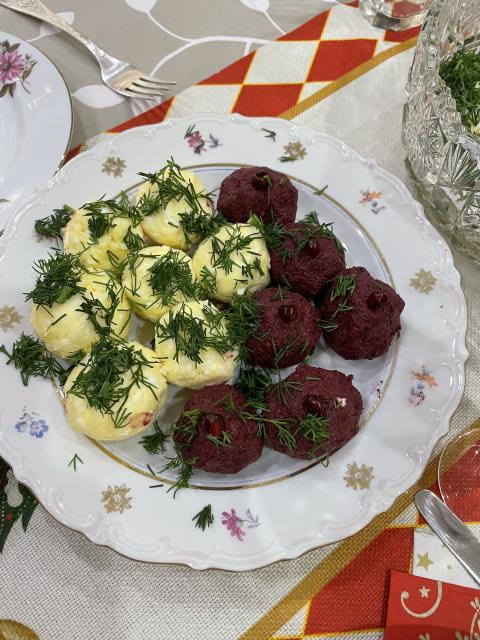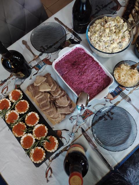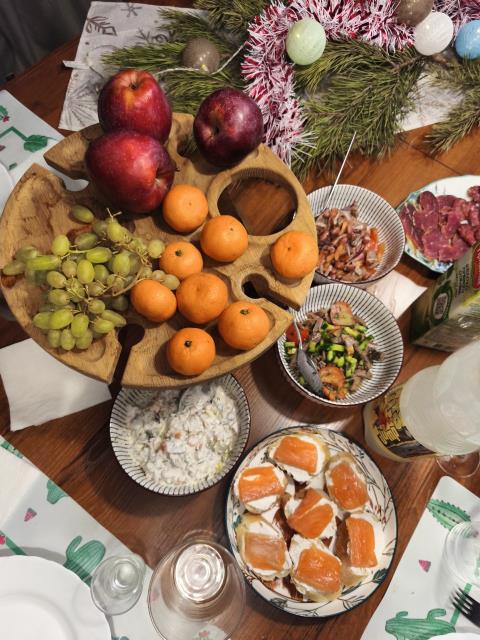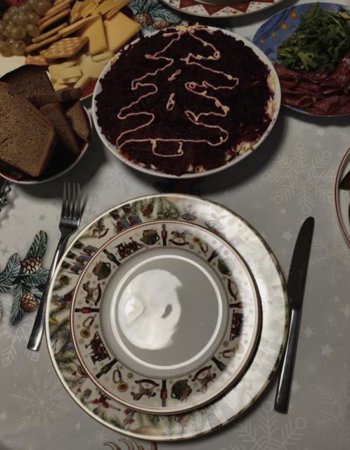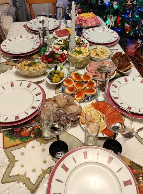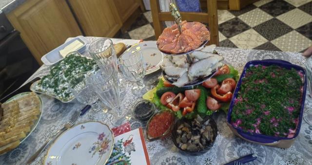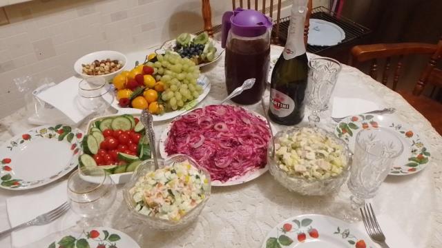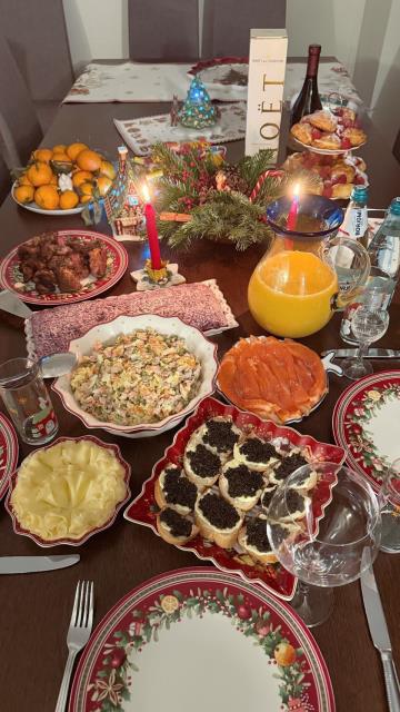 Каждый что-то готовит. Я - обычно салат «Рождественский венок»)) , большой такой, на огромном блюде. Ну и посуду, которая я маме дарила, здесь видно.