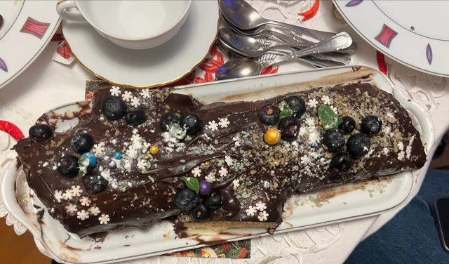 У нас диет версия: бисквитный рулет с кремом с минимальным количеством жира - крем Шибуст, бисквит слегка пропитан апельсиновым соком. Сверху шоколадный ганаш с 20 процентными сливками.