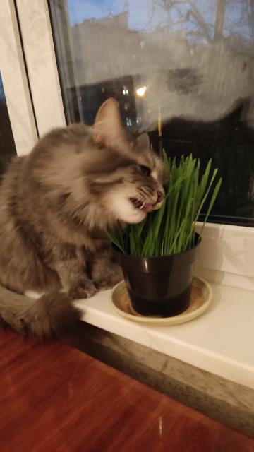 После того, как предыдущий кот (которого котенком взяли из подсобки Пятерочки) поймал инфекцию от травы, принесенной из Ботанического сада и три дня лежал под капельницей, выращиваю траву сама. Покупаю овес на рынке и сажаю в два горшочка. Пока из одного есть, в другом прорастает.