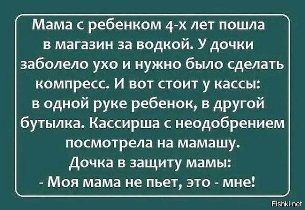 Про водку. Старшие маленькие, нужно было водочный компресс сделать, заболели. Я, как была, в домашнем затрапезном, чумная от недосыпа, накинула куртку гулятельную собачью и помчалась в магазин шаговой доступности. Корзин не было на входе, да мне и не надо, поэтому сунула в карманы по чекушке водки, себе пару сырков глазированных, мчусь на кассу. Очередь на меня очень неодобрительно смотрит, ну а я, ничего лучше не смогла, чем брякнуть: Нам не пить, чисто разогреться. :)) очередь насупилась еще больше.:)))