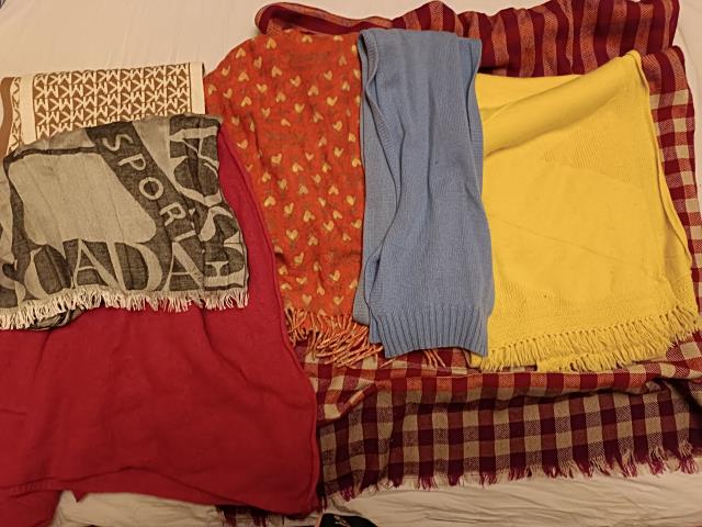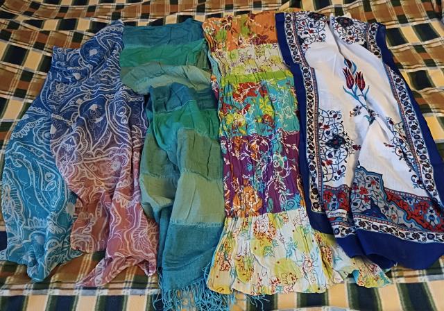 Не добралась до шкафа.. Штук 30, наверное. Но они или не зимние, или сейчас не используются, поэтому далековато лежат. Близко только вот эти попались. Вязаный снуд ношу, светлый был под куртку, остальные выполняют роль зонтика - повязываю на голову во внезапный дождь.Красный однотонный и индийский неописуемой расцветки - натуральный шелк. Я раньше куртки не носила, было много разного такого под пальто