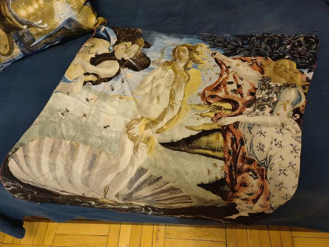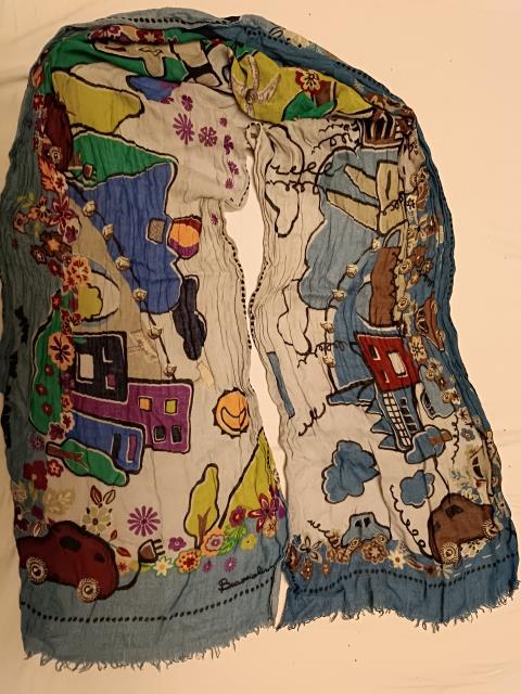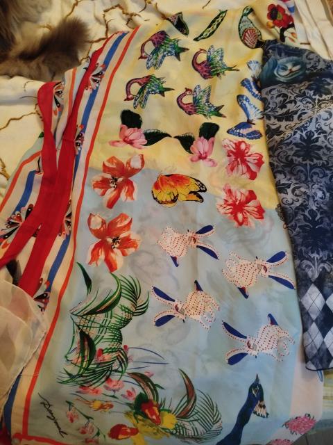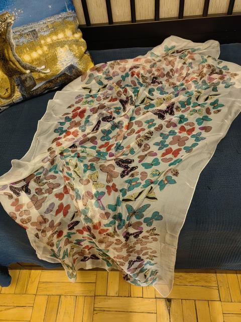 Вот упомянутые Эстонские снуды. И к ним же шарфик, в Пярну купленный. Потом хлопковый так сказать шарфик, ношу это платок углом, как шарф, в демисезонье. Потом натуральный шелк, итальянские платок и шарф, бабочки и рождение Венеры. Рождение Венеры ношу практически постоянно весной и осенью. И еще один натурально шелковый шарфик кукла отняла, наготу прикрыть. Очень хочу его себе обратно) Надо обязательно к весне платье ей справить и шарфик свой отобрать. Это самые любимые и носимые. И еще куча надеть на один раз к определённому случаю или наряду.