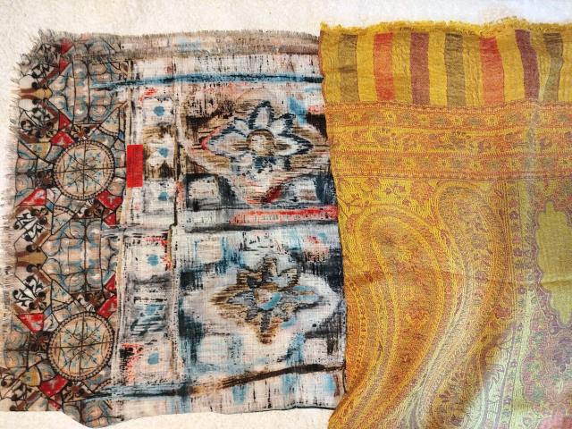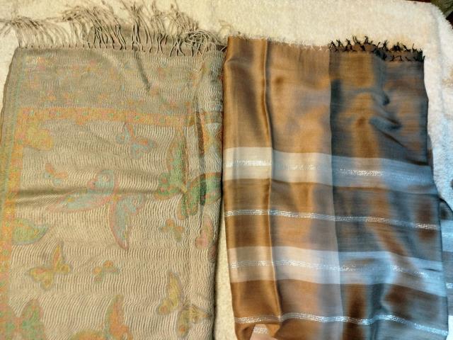 у меня самые ходовые это две пашмины - зимняя, бежевая, и полегче, неотбеленный белый. но на вид - вообще никакие, просто куски ткани ))) только близко можно понять что это такое