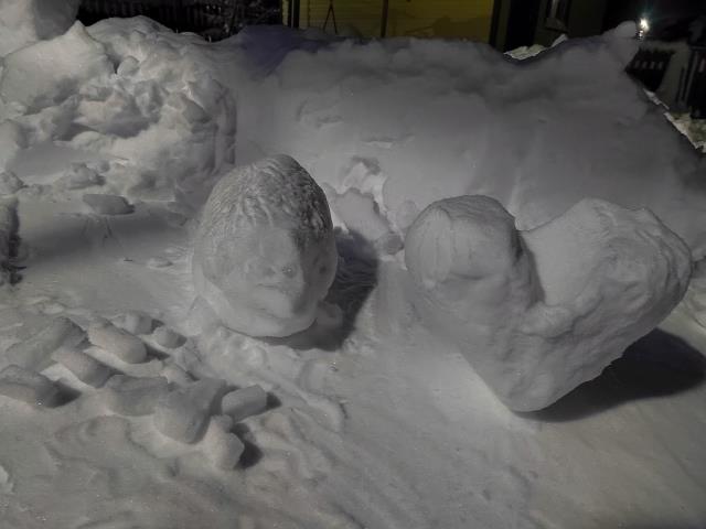 Температура в пятницу в 23 часа. Почти закат в субботу. И дети вырезали фигурки из снега, строили домики, туннели... Хоть и морозно было, гуляли долго.