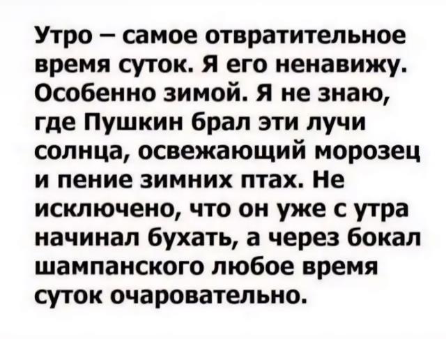 Зиму люблю не больше чем 2 недели в году. Можно и неделю всего, а то и вообще пару дней. Но чтоб солнце было яркое и небо чистое. Солнце и ясное небо люблю всегда, не надоедает. Дожди и пасмурность не люблю, но редко может быть ок. 27.01.2026 04:22:04, KengaLu