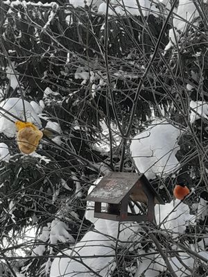 Прочитала вашу тему, взглянула в окно, а там мои радости - синицы клюют сало, а снегири предпочитают семечки. Ну и кот на глаза попался.