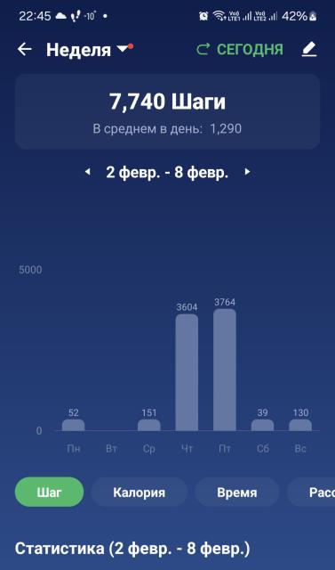 Не, ну это ужас для меня. Вот сегодня ходила в бассейн, худо-бедно за день 7100 шагов находила, но все равно мало. Хорошо себя чувствую, когда в районе 10 тыс подучается. В субботу много ходила, 15000 получилось. А 7700 за неделю это вообще ни о чём.