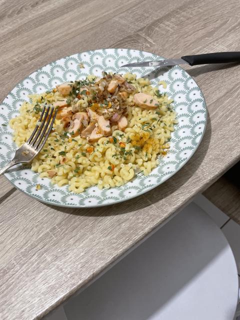 Вот пример того что он готовит - макароны, Salmon, и какая то овощная зажарка.