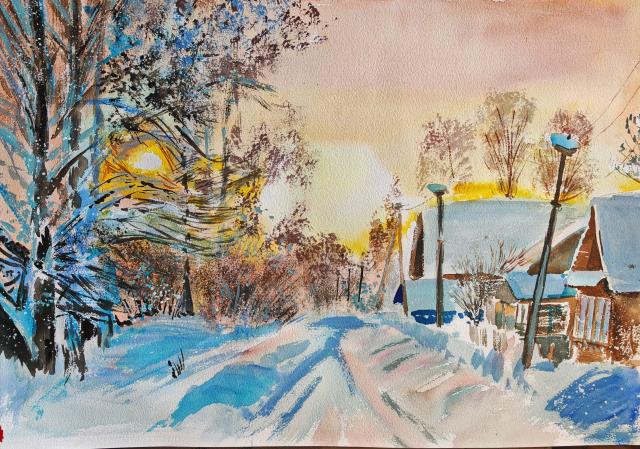 Нарисовала ещё картинку, хотя зима всем надоела... Но за городом снег не тает...