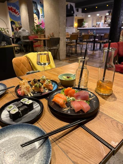Обожаю китайские заведения, где платишь фиксированную цену (в этом - 19,9), и по планшету заказываешь все, что хочешь, без ограничений. Есть ВСЕ:))) Мясо, рыба, морепродукты, овощи, десерты. Приносят очень быстро. Нам повезло: это было открытие сетевого заведения в новой локации, и каждому посетителю выдавали еще и мешок с подарками: соевый соус, лимонад и креветочные чипсы (сыну пригодится)