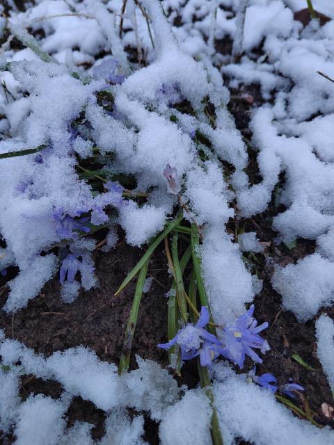 Цветочки снегом придавило. Я вчера только один куст пионов укрыла, они хорошо так проросли уже, жалко стало-уже подмерзали в предыдущие годы.