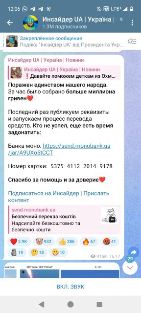 В вашем закрыта:) - к концу вчерашнего дня Банковая полностью убрала из медиа и соцсетей тему «чья ракета ударила» по Охматдету, переключившись на позитив по сбору бабла на фоне трагедии, который должен был показать единство нации и подъем морального духа, но всё настолько было наиграно и искусственно, что деньги собрали «по звонку из ОП» с крупного и приближенного бизнеса, а моральный дух общества так и остался внизу. Тему с ракетой не обсуждают, так как в комментариях слишком много задают вопросов и скидывают разборы, где указывается, что ракета была украинской. Крыть это нечем. Еще - Банковая боится одного - того, что западные журналисты проведут свой разбор и расследование, которое подтвердит версию, что ракета попавшая в больницу, была украинской. И да, собственными глазами я вчера видела на Инсайдере отчет о том, какой канал и сколько перечислил... больше всего меня смутил некий фонд Зеленского (?), также как с аферами Притулы хорошо бы через несколько лет узнать, сколько автомобилей и вилл было куплено на эти деньги, но вы же "не рабы", вам это неинтересно, да и кто же вам это расскажет:)09.07.2024 12:05:11, Lubanya