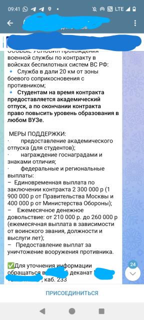 Во всех вузах прошли собрания студентов, имеющих хвосты. В миит через личные кабинеты приглашали на беседу не только студентов, имеющих задолженности, но и всех, в том числе и девочек без задолженностей. Странно, что вы этого не знаете. Предлагают подписывать контракт на год со службой БПЛА. Во всех официальныых аккаунтах вузов в тг эта реклама висит. А теперь самое интересное, о чем пишут военные юристы- нет контракта от МО на год, в контрактах нет записи , что гарантирована служба именно в частях БПЛА. Есть ли студенты, которые заключили контракты таким образом? Есть. Как и есть уже и суды, признавшие неправомерным такое заключение контрактов. Но выиграла суд мама-юрист, вряд ли такое возможно в отношении иных ребят. Небольшая ремарка- прошедшие сво имеют имеют льготы бви такие же , как и ребята- выпускники школ. Без ранжирования (то есть всех) зачисляют только после тяжёлых ранений.